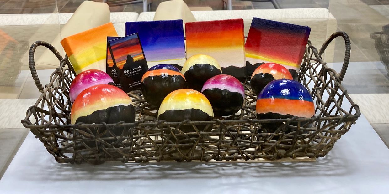 Above: Sunsets of the New Mexico Seasons, painted buffalo gourds.